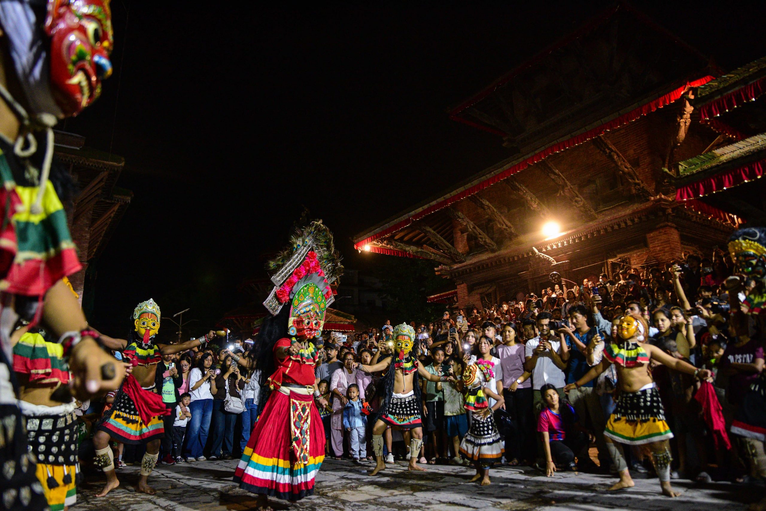 काठमाडौं । ईन्द्रजात्रामा महाकाली नाचको प्रस्तुतिमा सहभागी कलाकारहरूले ईन्द्रजात्राको क्रममा काठमाडौं दरबार स्क्वायर, हनुमान ढोकामा पवित्र नृत्य प्रदर्शन गरेका छन् ।