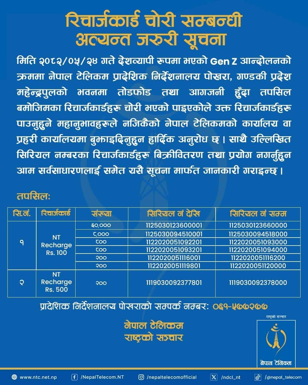 कम्पनीले तोडफोड र चोरीका क्रममा हराएका रिचार्ज कार्डहरूको विवरण सार्वजनिक गर्दै ती कार्ड प्रयोग नगर्न आग्रह गरेको छ। साथै, फेला परेमा नजिकैको नेपाल टेलिकम कार्यालय वा प्रहरी कार्यालयमा बुझाइदिन समेत अनुरोध गरेको छ।