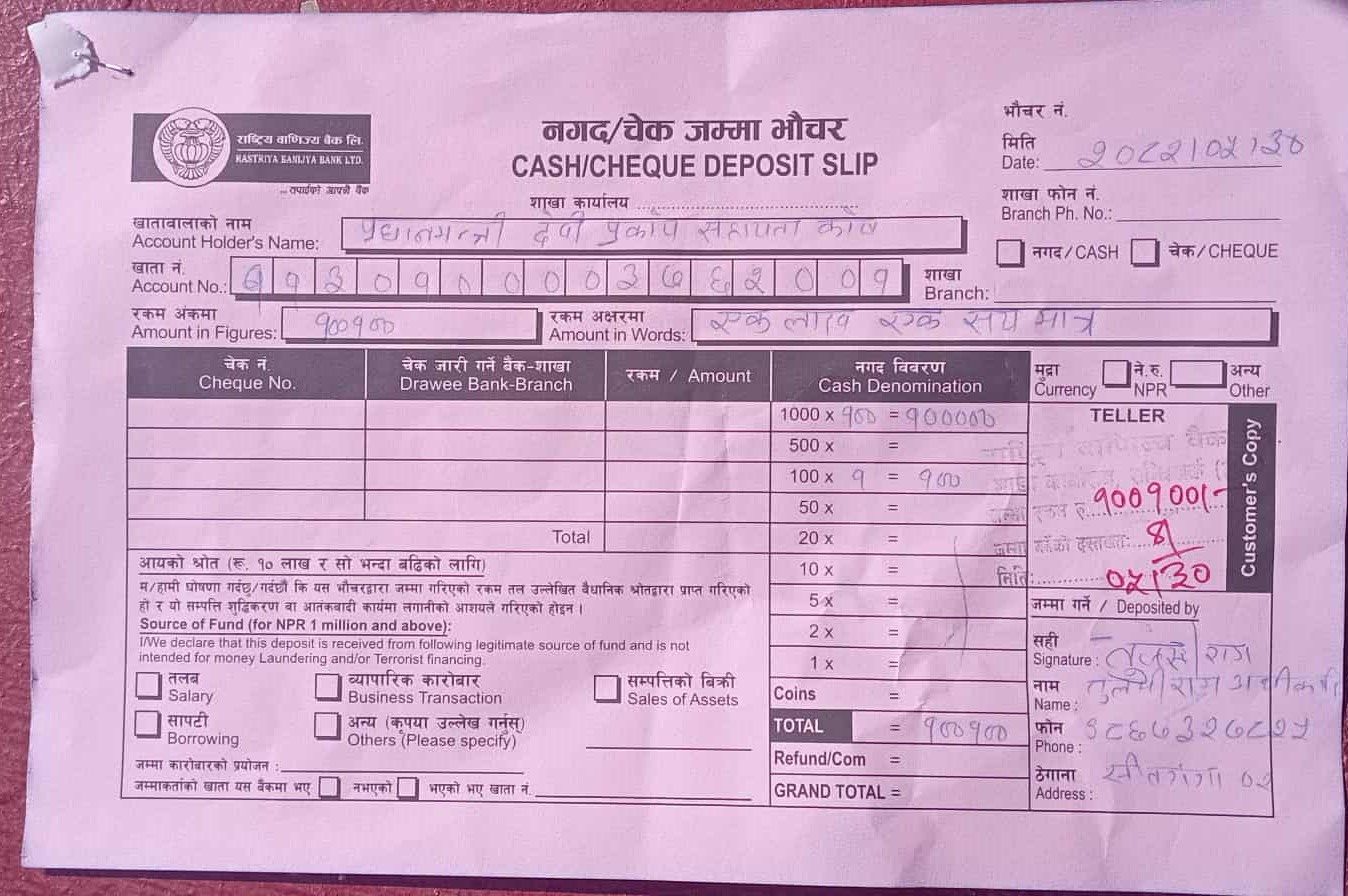 जिल्ला प्रशासन कार्यालयमा सोमबार पुगेका उनले यो भनिरहँदा आँखाभरी आशु टलपिलएका र बीचबीचमा भक्कानिएका देखिन्थे । ‘मैले आत्मशान्तिका लागि, सुत्न सक्छुकी भनेर दिएको हो, धेरै कमाएर दिएको होइन, सिंहदरबारको श्रद्धाका लागि हो । कुन प्रकृयाबाट जाँदा सहयोग गर्न सकिन्छ भनेर जिल्ला प्रशासनमा आएको हुँ । म किसान हुँ, टिमुर, अकबरे खुर्सानी, काँक्रा बेचेर जम्मा गरेको रकम हो ।’