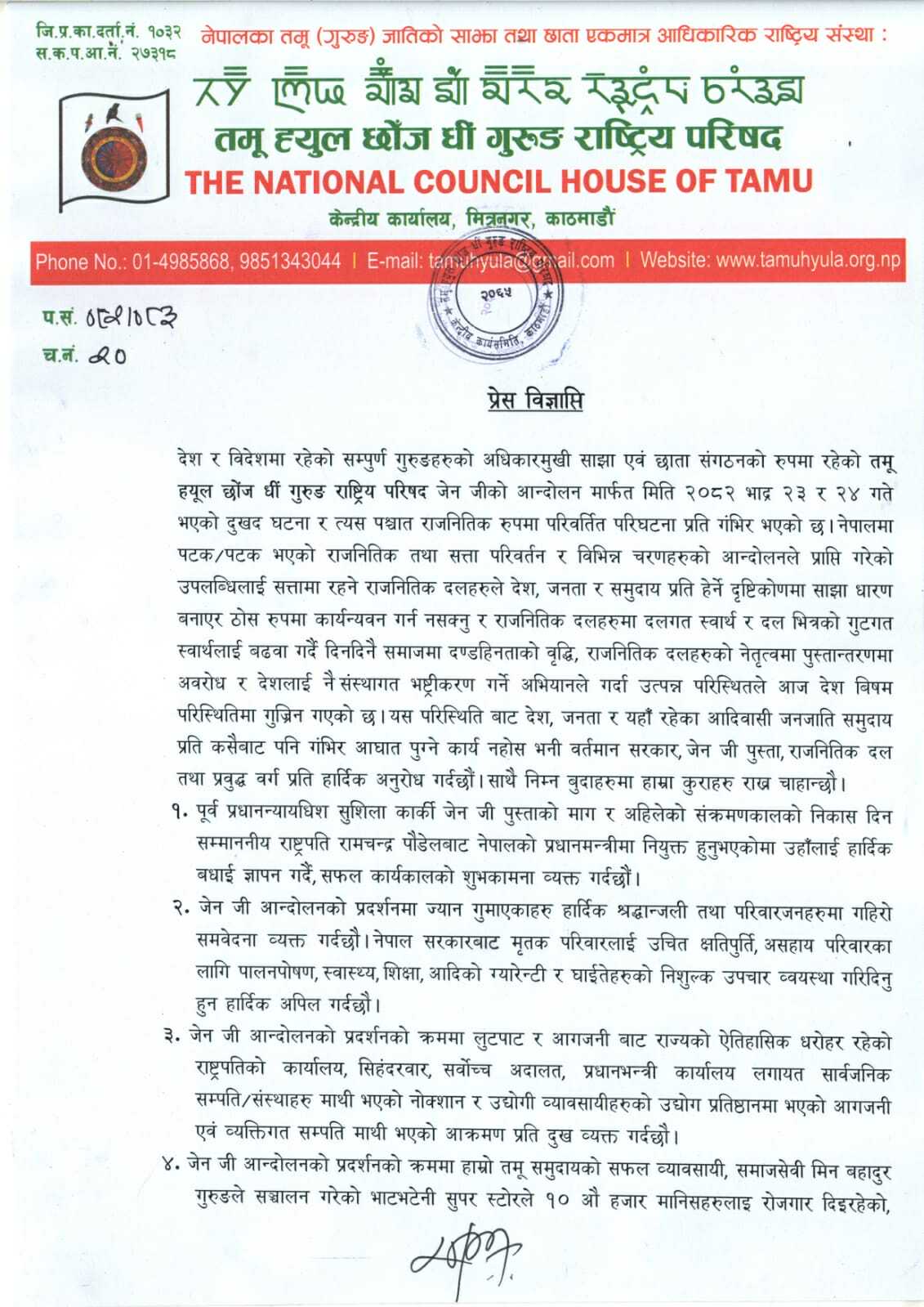 काठमाडौं । जेनजी आन्दोलनको क्रममा देशभरमा भएको घटनाप्रति तमु ह्युल छोज धीं गुरुङ राष्ट्रिय परिषद्ले ध्यानाकर्षण भएको बताएको छ । आन्दोलनका क्रममा ऐतिहासिक सम्पदा, सरकारी कार्यालय, उद्योग व्यवसाय, प्रहरी चौकीलगायत स्थानमा भएको तोडफोड, आगजनी र लुटपाट घटनाप्रति परिषद्ले दुःख व्यक्त गर्दै यसलाई निन्दनीय भनेको छ ।