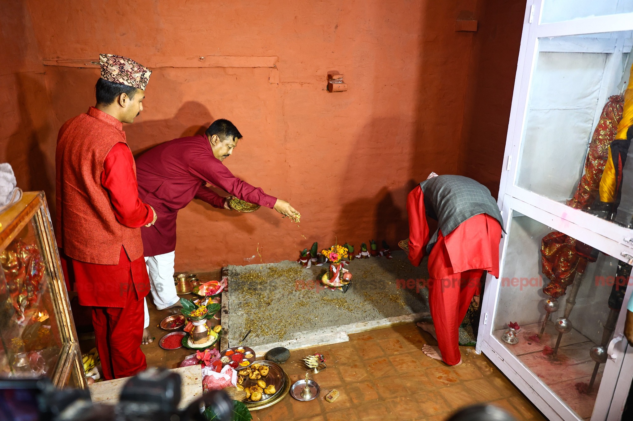 बिहानै नित्य कर्म समाप्त गरी नजिकको नदी वा चोखो स्थलबाट बालुवा वा माटो ल्याई गाईको गोबरले लिपपोत गरिएको पूजा कोठा अथवा दशैं घरमा विधिपूर्पक राखेर त्यसमाथि जौं छरिन्छ ।