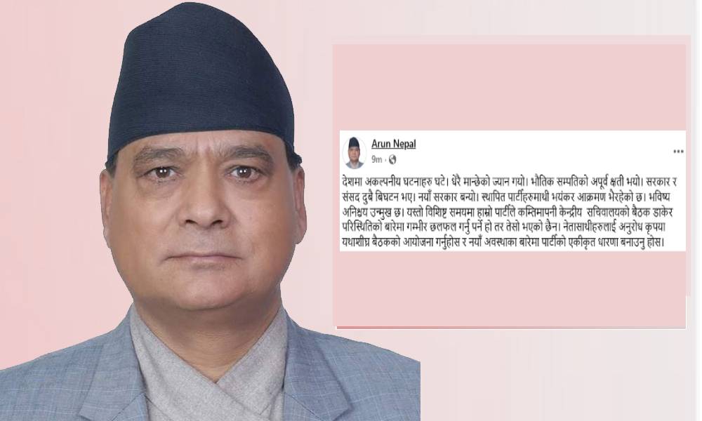 काठमाडौं । नेकपा एमालेका पोलिटब्युरो सदस्य अरुण नेपालले तत्काल पार्टीको बैठक राखेर यसबीचमा भएका घटना र परिवर्तनहरूको बारेमा गम्भीर छलफल गर्न माग गरेका छन् ।