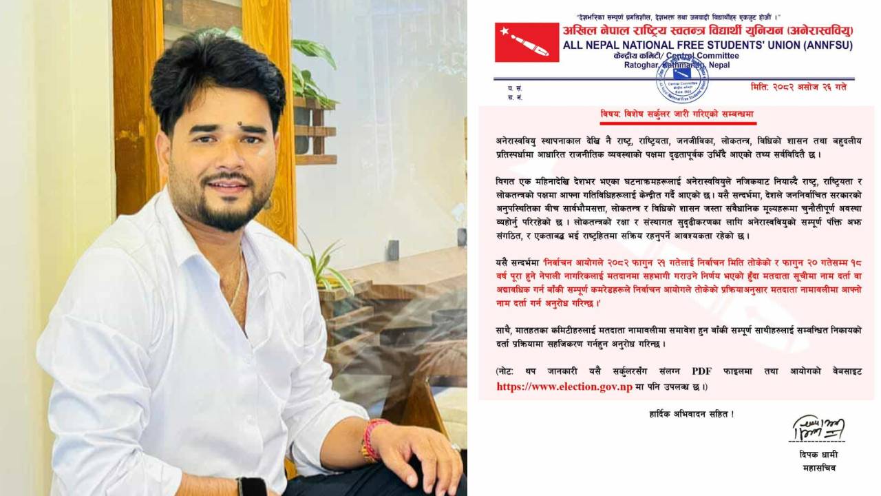 अनेरास्ववियुका महासचिव दिपक धामीले सर्कुलर जारी गर्दै कमिटी मातहतका विद्यार्थीहरूलाई मतदाता नामावलीमा नाम दर्ता गराउन आग्रह गरेका छन् ।