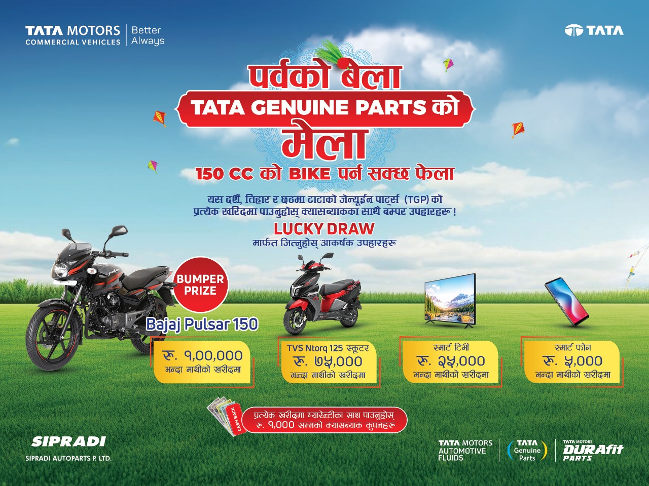 संवेदनशील परिस्थितिका कारण केही समय स्थगित गरिएको यस योजना पुनः सुरु गर्दै कम्पनीले ग्राहकलाई विशेष उपहारसहित आकर्षक अफर ल्याएको हो। यस अन्तर्गत टाटा जेन्युइन पार्ट्सको हरेक खरिदमा ग्यारेन्टीसहित १,००० सम्मको क्यासब्याक कुपन प्राप्त गर्न सकिनेछ। साथै, लक्की ड्रमार्फत विभिन्न पुरस्कार जित्ने अवसर पनि उपलब्ध हुनेछ।