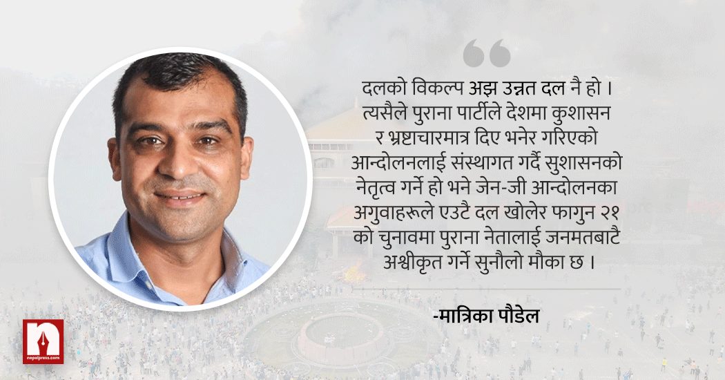 दलको विकल्प अझ उन्नत दल नै हो । त्यसैले पुराना पार्टीले देशमा कुशासन र भ्रष्टाचारमात्र दिए भनेर गरिएको आन्दोलनलाई संस्थागत गर्दै सुशासनको नेतृत्व गर्ने हो भने जेन-जी आन्दोलनका अगुवाहरूले एउटै दल खोलेर फागुन २१ को चुनावमा पुराना नेतालाई जनमतबाटै अश्वीकृत गर्ने सुनौलो मौका छ ।