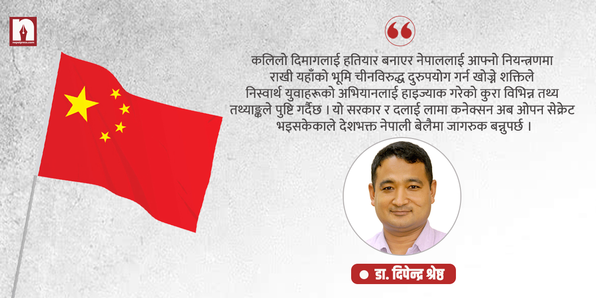 यद्यपि नेपालको समृद्धिको असल चाहनाले पनि कयौँ सहयोगहरू प्रदान गरेका होलान् । समृद्धिको भोको नेपालले बाहिरी सहयोग बिना सो सपना पुरा गर्ने अवस्था पनि छैन, सहयोग स्वीकार्नुको विकल्प पनि छैन । आफ्नो नीति कार्यान्वयनका लागि स्थापित संस्थामार्फत नेपालका विभिन्न सामुदायिक, वर्गीय, भौगोलिक, धार्मिक, जातीय समस्या तथा मुद्दाहरूको उत्थान गरी जनतालाई म्यानिपुलेट गर्ने क्रियाकलापहरू लामो समयदेखि भइरहेका छन् । विशुद्ध नेपाल र नेपालीको हितमा देखिने यस्ता सहयोग, परियोजना तथा सामाजिक क्रियाकलापबाट समेत सुषुप्त रूपमा चीन विरोधी गतिविधिहरू हुँदै आएको नै थियो ।
