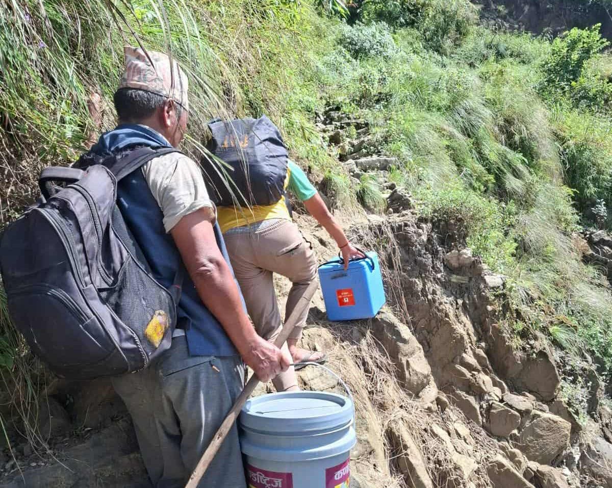 डोटी । डोटी पिठ्यूमा आधारभूत स्वास्थ्य उपकरणको झोला, एक हातमा खोप राख्ने कोल्ड बक्स, अर्को हातले भित्ताको सहारा लिदै भीरमा उक्लिरहेका छन् लालबहादुर बुढा क्षेत्री । उनलाई पछ्याउँदै छन् सहयोगी टिकाराम घर्तिमगर।