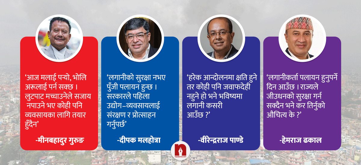 उनले भने, ‘यस्ता घटनाले विदेशी लगानी त परको कुरा, स्वदेशी लगानीकर्ता पनि पलायन हुन सक्छन् । राज्यले नागरिकको जीउधनको सुरक्षा गर्न सक्दैन भने कर तिर्नुको औचित्य के रहन्छ ?’