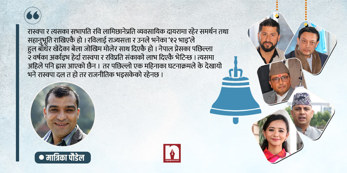 भूमिका नबाँधी चुरो कुरा सुरुमै भनिहालौं-राष्ट्रिय स्वतन्त्र पार्टी र त्यसका सभापति रवि लामिछानेप्रति मेरो अतिरिक्त आशासँगै व्यवसायिक दायरामा रहेर समर्थन तथा सहानुभूति रहेकै हो । रविको पक्षमा लेख्यो भनेर धेरै प्रहार आफ्नै विरादरीबाट खेपिएकै हो । नेपाल प्रेसका पछिल्ला २ वर्षका अर्काइभ हेर्दा रास्वपा र रविप्रति समर्थनभाव राखिएकै हो । त्यसमा अहिले पनि ह्रास आएको छैन ।