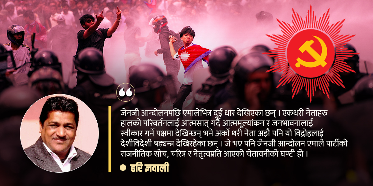 जेनजी आन्दोलनपछि एमालेभित्र दुई धार देखिएका छन् । एकथरी नेताहरू हालको परिवर्तनलाई आत्मसात् गर्दै आत्ममूल्यांकन र जनभावनालाई स्वीकार गर्ने पक्षमा देखिन्छन् भने अर्को थरी नेता अझै पनि यो विद्रोहलाई देशी विदेशी षड्यन्त्र देखिरहेका छन् ।