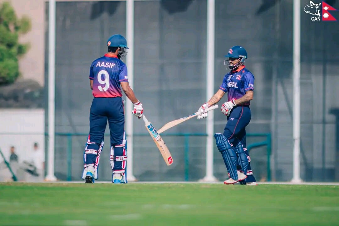 नेपालका दुई खेलाडीले अर्धशतक प्रहार गरे । आसिफ शेख ४१ बलमा ६९ र दीपेन्द्रसिंह ऐरीले ३३ बलमा ५३ रनको योगदान दिए । कुशल भुर्तेल १७ र आरिफ शेख ९ रनमा आउट भए । कप्तान रोहित पौडेल १२ बलमा २१ र लोकेश बम १२ बलमा ३९ रनमा अविजित रहे ।