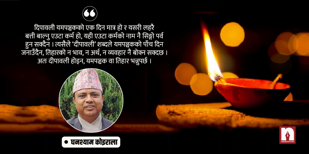 पछिल्लो समय तिहारका ठाउँमा ‘दीपावली’ लेख्ने प्रचलन बढेको देखिन्छ । दीपावली भन्ने नराम्रो होइन । दीपावली भनेको लस्कर बत्ती वा बत्तीको ताँती भनेको हो । तिहार(यमपञ्चक)को एक दिन औँसीको रात्रि-सुखरात्रिमा धनधान्यकी देवी लक्ष्मीको स्वागतका लागि दीपावली (लहरै बत्ती बाल्ने) गर्ने गरिन्छ । औँसीको रात्रिमा प्राकृतिक अन्धकारलाई चिर्ने मानवीय प्रयासको यो कर्मको महत्त्व छ । तर, यो दिन यमपञ्चकको एक दिन मात्र हो र यसरी लहरै बत्ती बाल्नु एउटा कर्म-काम हो, यही एउटा कर्मको नाम नै सिङ्गो पर्व हुन सक्दैन । त्यसैले ‘दीपावली’ शब्दले यमपञ्चकको पाँच दिन जनाउँदैन, तिहारको न भाव, न अर्थ, न व्यवहार नै बोक्न सक्दछ । अतः दीपावली होइन, यमपञ्चक वा तिहार भन्नुपर्छ ।