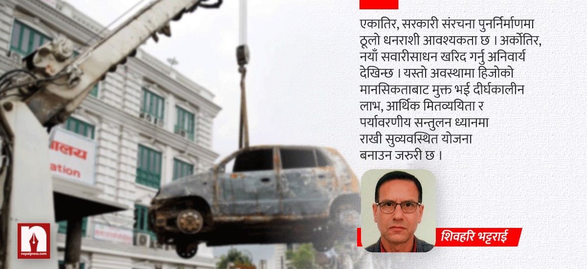 एकातिर, सरकारी संरचना पुनर्निर्माणमा ठूलो धनराशीको आवश्यकता छ भने अर्कोतिर, क्षतिग्रस्त सवारीसाधनको सट्टामा नयाँ सवारीसाधन खरिद गर्नु अनिवार्य देखिन्छ । यस्तो अवस्थामा हिजोको मानसिकताबाट मुक्त भई दीर्घकालीन लाभ, आर्थिक मितव्ययिता र पर्यावरणीय सन्तुलनलाई ध्यानमा राखी एक सुव्यवस्थित योजना बनाउनु जरुरी छ । आजको यो सङ्कटलाई सरकारी सवारीसाधन व्यवस्थापनमा क्रान्तिकारी सुधार गर्ने ऐतिहासिक अवसरका रूपमा परिणत गर्न सकिन्छ ।