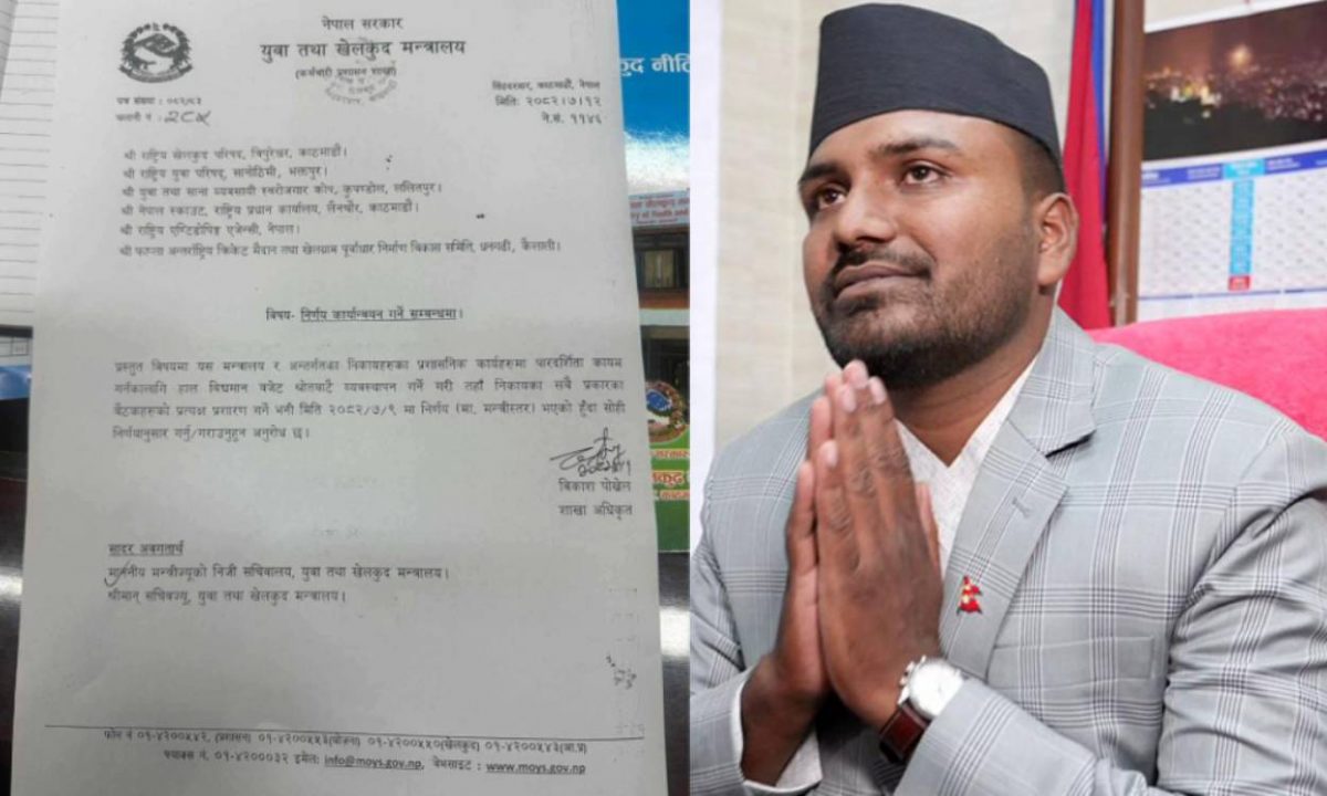 त्यसै बमोजिम राष्ट्रिय खेलकुद परिषद, राष्ट्रिय युवा परिषद, युवा तथा साना व्यवसायी स्वरोजगार कोष, नेपाल स्काउट, राष्ट्रिय एन्टिडम्पिङ एजेन्सी, फाप्ला अन्तर्राष्ट्रिय क्रिकेट मैदान तथा खेलग्राम पूर्वाधार निर्माण विकास समिति धनगढीलाई पत्राचार गरिएको हो ।