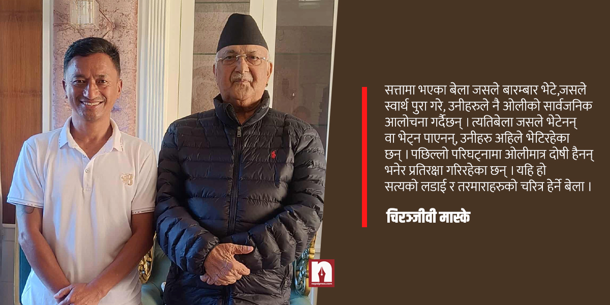 भेट्न किन चाहिन भने मलाई कुनै स्वार्थ लिनु नै थिएन । सत्तामा भएका बेला जसले भेटे, जसले स्वार्थ पुरा गरे, उनीहरूले नै ओलीको सार्वजनिक आलोचना गरे । आगोमा घिउ थपे । त्यतिबेला जसले भेटेनन् वा भेट्न पाएनन्, उनीहरू अहिले भेटिरहेका छन् । पछिल्लो परिघटनामा ओली मात्र दोषी हैनन् भनेर प्रतिरक्षा गरिरहेका छन् । यही हो सत्यको लडाई !