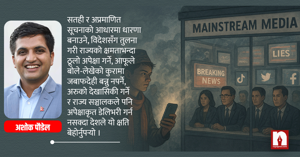 अहिले सामाजिक सञ्जालले मिडिया र पाठकलाई यति धेरै प्रभावित पारेको छ कि मूलधारका मिडियामा आएका समाचार तथ्यसहित भएपनि गलत हो भन्ने भाष्य बनिरहेको पाइन्छ ।