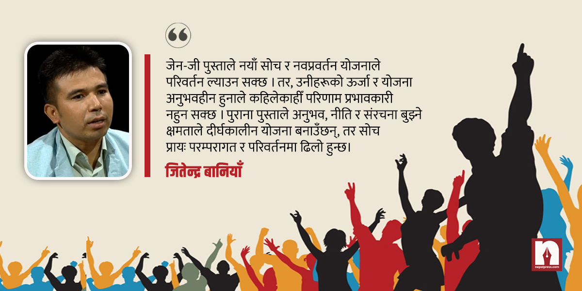 देशको प्रगति र विकासमा युवा शक्ति र अनुभव दुवै आवश्यक हुन्छ। जेन–जी पुस्ता नवीन विचार, ऊर्जा र प्रविधिमा दक्ष छ भने पुराना पुस्ताले अनुभव, रणनीति र निर्णय क्षमतामा बल दिन्छ। देश निर्माणको वास्तविक बाटो भनेको यी दुई पुस्ताबीच सहकार्य र सामूहिक दृष्टिकोण निर्माण गर्नु हो।