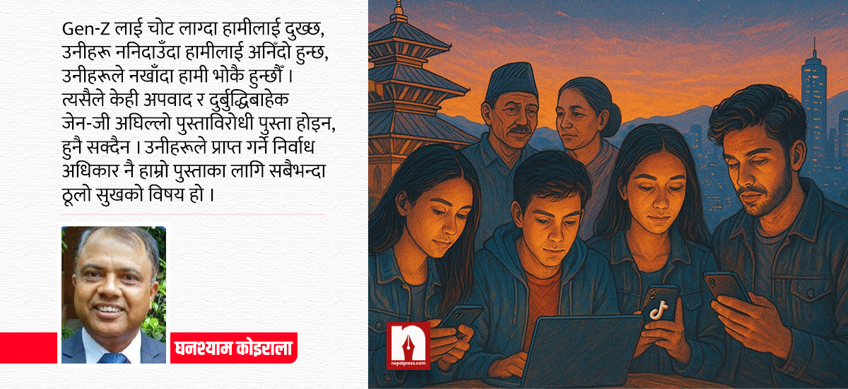 अनि, हामी र उनीहरू, हाम्रो स्वार्थ र उनीहरूका चाहना भिन्न हुन सक्छन् त? सक्दैनन्। उनीहरूलाई चोट लाग्दा हामीलाई दुख्छ, उनीहरू ननिदाउँदा हामीलाई अनिँदो हुन्छ, उनीहरूले नखाँदा हामी भोकै हुन्छौँ। त्यसैले केही अपवाद र दुर्बुद्धिबाहेक जेन-जी र अघिल्लो पुस्ता विरोधी पुस्ता होइन, हुनै सक्दैन। उनीहरूले पाउने अधिकारमा हाम्रा अधिकार काटिँदैनन्। उनीहरूले प्राप्त गर्ने निर्वाध अधिकार नै हाम्रो पुस्ताका लागि सबैभन्दा ठूलो सुखको विषय हो।