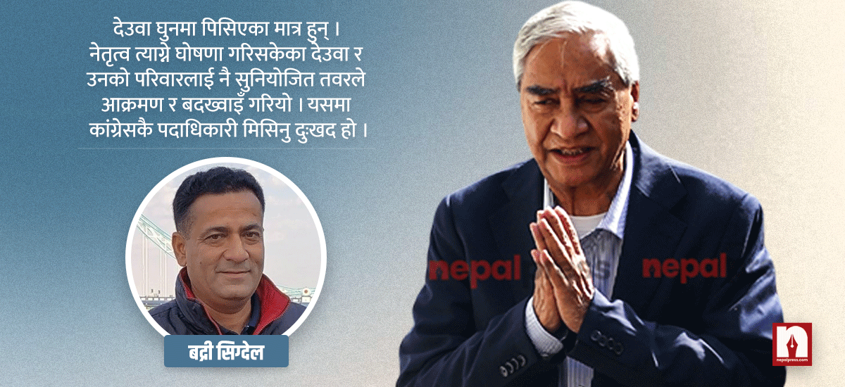म सुरुमै भन्न चाहन्छु, नेपाली कांग्रेस पार्टीमा जीवन समर्पण गरी लामो समयदेखि नेतृत्वमा रहेका शेरबहादुर देउवाको पक्ष या विपक्षमा धार खडा गर्न यो लेख लेखिएको होइन । त्यसरी लेख्नका लागि रुचिका पात्र उहाँसँग नभएका होइनन् । यहाँ मैले शब्द खर्च गरिरहनु पर्दैन ।