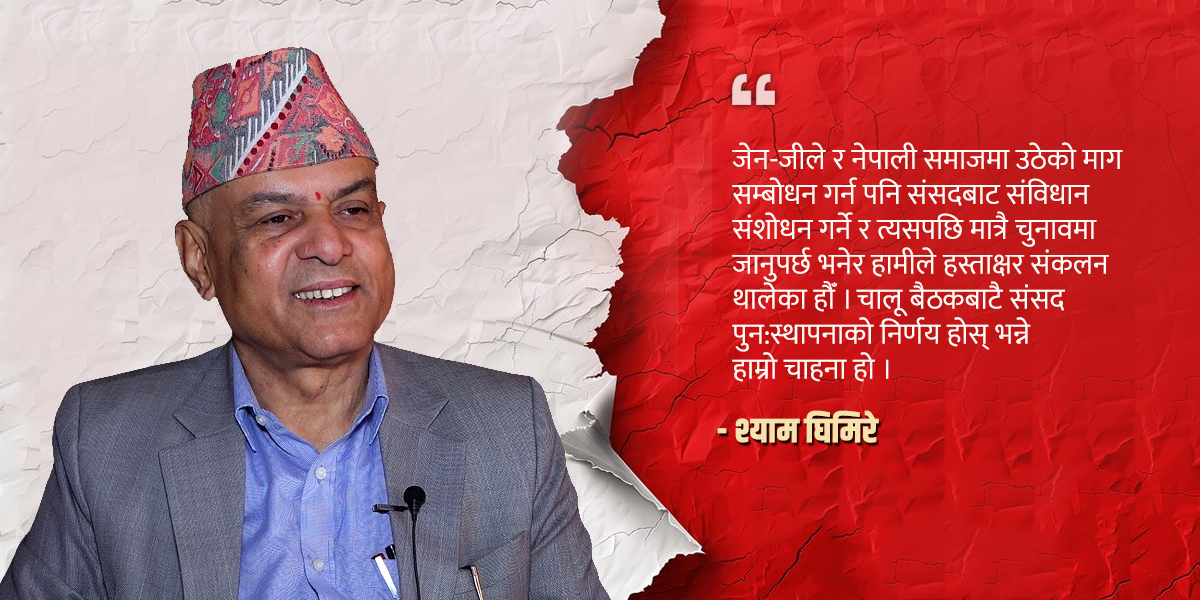 प्रतिनिधिसभाको पुनर्स्थापनाको लागि हस्ताक्षर थालेका हौँ । अहिलेसम्म ४० भन्दा बढी सांसदहरूले गरिसक्नुभएको छ । अहिले पनि अभियान जारी छ । पार्टीले संसद् विघटन र सरकार गठन प्रक्रियालाई असंवैधानिक र अलोकतान्त्रिक भनिसकेकाले अब ट्र्याकमा ल्याउने विकल्प संसद् पुनर्स्थापना नै हो । जेनजीले उठाएका र नेपाली समाजमा उठेको माग सम्बोधन गर्नको लागि पनि संविधान संशोधन गर्ने र त्यसपछि मात्रै चुनावमा जानुपर्छ भनेर हामीले हस्ताक्षर संकलन थालेका हौँ। पार्टीले चालू बैठकबाटै यो निर्णय गरेर अघि बढोस् भन्ने हाम्रो चाहना हो ।