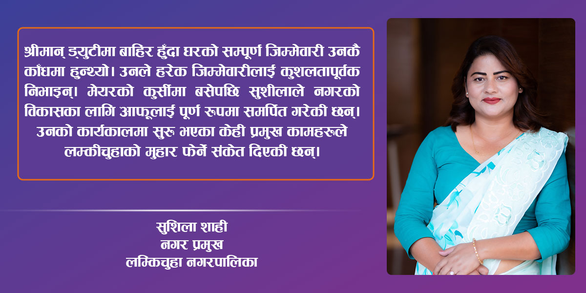 धनगढी । सुदूरपश्चिम, कैलाली जिल्लाको लम्कीचुहा नगरपालिकाको नेतृत्व गरिरहेकी सुशीला शाही। समाजको पितृसत्तात्मक सोच, पार्टीभित्रको आन्तरिक संघर्ष र जनताको अपार अपेक्षाबीच सन्तुलन मिलाउँदै अघि बढेकी उनी एक ‘फाइटर’ मेयरका रुपले पनि चिनिएकी छिन्।