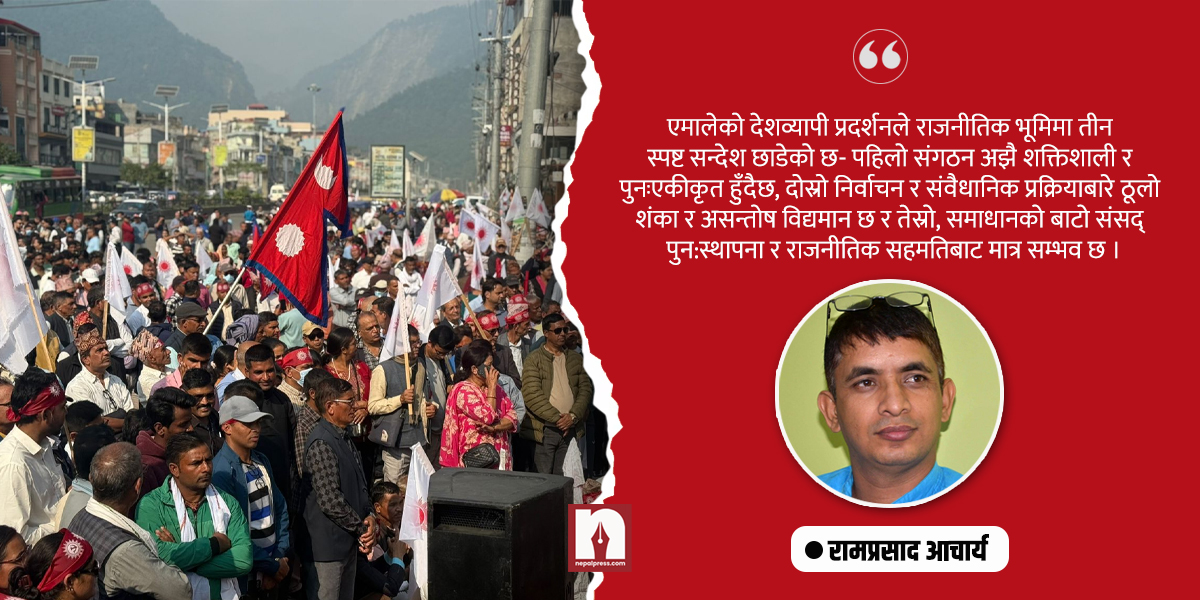 यस्तो राजनीतिक परिस्थितिमा एमाले दुई ठूला लक्ष्य लिएर अघि बढिरहेको देखिन्छ । एक, संसद् पुनर्स्थापना र राजनीतिक सहमतिलाई पहिलो प्राथमिकता ठान्दै सरकारलाई निरन्तर दबाबमा राख्ने । दुई, निर्वाचन भए पनि नभए पनि आफूलाई देशको सबैभन्दा व्यवस्थित, स्थिर र वैकल्पिक शक्तिका रूपमा पुष्टि गर्ने । मङ्सिर ६ को काठमाडौं प्रदर्शन यही रणनीतिक यात्राको निर्णायक मोड हो–जहाँ सडक, संगठन र चुनावी मनोविज्ञान एकै ठाउँमा जोडिनेछ ।