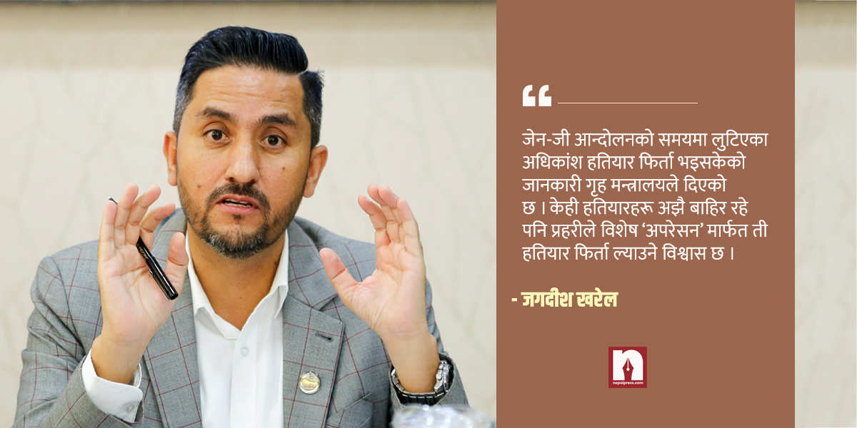जेन-जी आन्दोलनको समयमा लुटिएका अधिकांश हतियार फिर्ता भइसकेको जानकारी गृह मन्त्रालयले दिएको छ । केही हतियारहरू अझै बाहिर रहे पनि प्रहरीले विशेष ‘अपरेसन’मार्फत ती हतियारहरु फिर्ता ल्याउने विश्वास छ । अहिले उत्पन्न सुरक्षा चुनौतीको सम्बन्धमा आयोगले गम्भीर रुपमा छलफल गरिरहेको छ ।