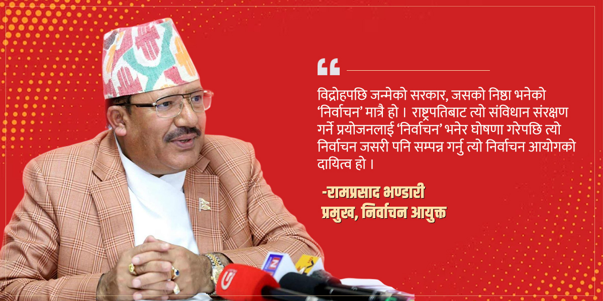यस कारण निर्वाचनको कुनै विकल्प छैन । संविधानको धारा उपधारामा खोजेर पाइँदैन । राष्ट्रपतिबाट त्यो संविधान संरक्षण गर्ने प्रयोजनलाई ‘निर्वाचन’ भनेर घोषणा गरेपछि त्यो निर्वाचन जसरी पनि सम्पन्न गर्नु निर्वाचन आयोगको दायित्व हो ।