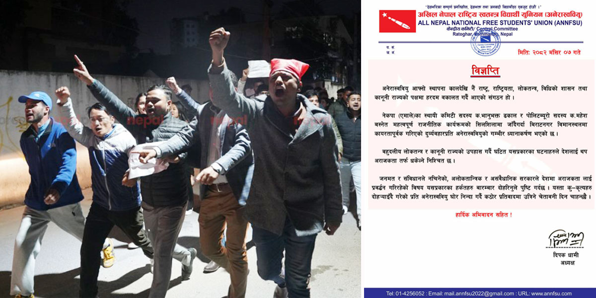 ‘यस्ता कुकृत्यहरु दोहर्‍याइँदै गरेको प्रति अनेरास्ववियु घोर निन्दा गर्दै कठोर प्रतिवादमा उत्रिने चेतावनी दिन चाहन्छौं ।’ आइतबार विज्ञप्ति जारी गर्दै अखिलले भनेको छ, ‘बहुदलीय लोकतन्त्र र कानूनी राज्यको उपहास गर्दै घटित यस प्रकारका घटनाले देशलाई थप अराजकतातर्फ धकेल्ने निश्चित छ ।’