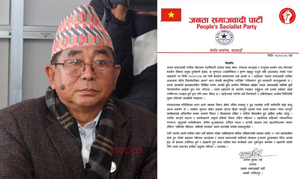 काठमाडौं । हस्ताक्षरसहितको पत्र छाडेर पार्टी परित्याग गरी नेपाली कम्युनिस्ट पार्टीमा एकताका लागि गएका राजेन्द्र श्रेष्ठसहितका नेतालाई जिम्मेवारी र अभिलेखबाट हटाइएको जनता समाजवादी पार्टी (जसपा) ले जनाएको छ ।