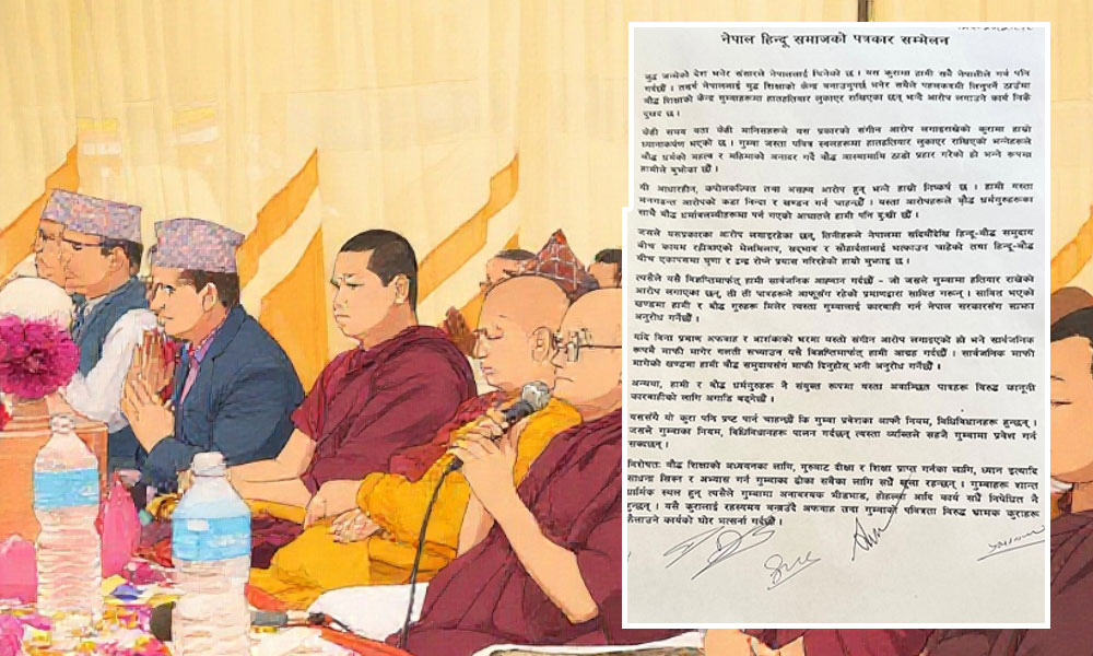 आज संयुक्त रूपमा जारी गरिएको विज्ञप्तिमा बौद्ध धर्मको तथा हिन्दू धर्मका गुरुहरुले पवित्र स्थल गुम्बाहरूलाई हतियार भण्डारणको अखडा भनी गरिएका अभिव्यक्तिलाई ‘कपोलकल्पित, मनगढन्ते र बौद्ध आस्थामाथिको ठाडो प्रहार’ भएको जनाएका छन् ।