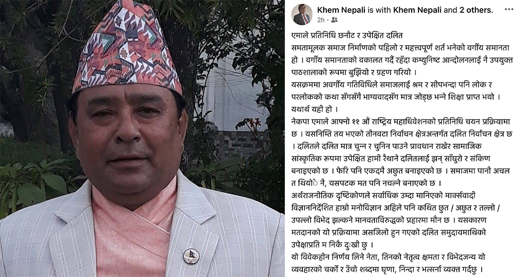 काठमाडौं । नेकपा (एमाले) निकट मुक्ति समाजका पूर्व महासचिव तथा राष्ट्रिय सभाका पूर्व सदस्य खेम नेपालीले पार्टीको ११औँ महाधिवेशनका लागि भइरहेको प्रतिनिधि छनोट प्रक्रियामा दलित समुदाय पुनः उपेक्षित भएको आरोप लगाएका छन् ।