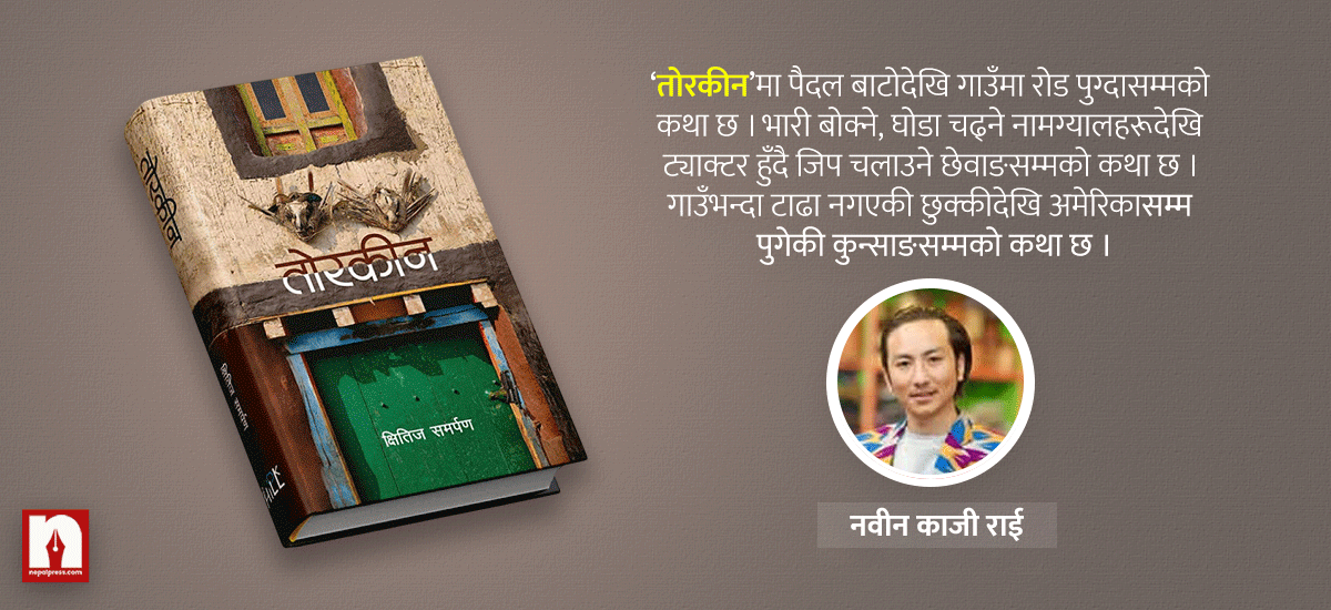 गाउँमा सुस्त–सुस्त छिरेको विकासको कथा पनि हो, ‘तोरकीन’ । सँगै बसाइसराइको कथा पनि हो । मान्छेहरू अवसर खोज्दै–खोज्दै गाउँ छाडेर पोखरा, काठमाडौंतिर बस्न थाल्छन् । जग्गा किन्न नसक्नेहरू टहरामै सही, पोखरातिर झर्न थाल्छन् ।