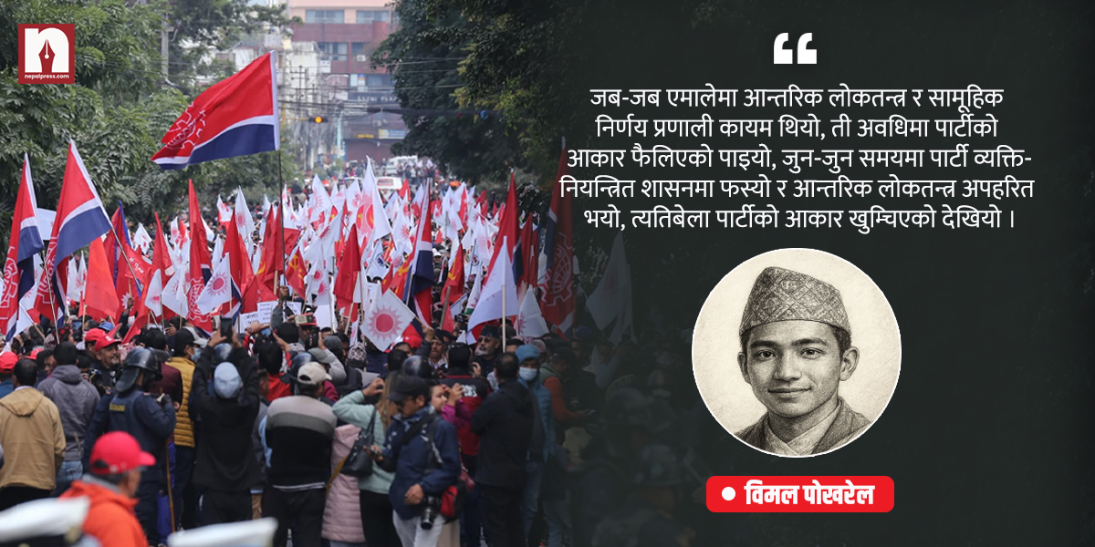 जब-जब एमालेमा आन्तरिक लोकतन्त्र र सामूहिक निर्णय प्रणाली कायम थियो, ती अवधिमा पार्टीको आकार फैलिएको पाइयो, जुन–जुन समयमा पार्टी व्यक्ति–नियन्त्रित शासनमा फस्यो र आन्तरिक लोकतन्त्र अपहरित भयो, त्यति बेला पार्टीको आकार खुम्चिएको देखियो ।