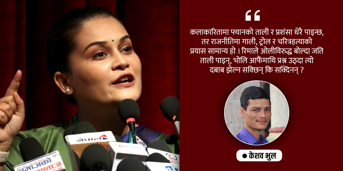 यस्तै राजनीति २४ सै घण्टाको जागिर हो । सुटिङ, कार्यक्रम र विदेश भ्रमणको व्यस्तताका बीच उनले पार्टी र जनतालाई कति समय दिन सक्छिन् रु यदि उनी पार्ट–टाइम राजनीतिज्ञ बनिन् भने निरन्तरताको प्रश्नले उनको पतन निश्चित छ । त्यो सँगै कलाकारितामा फ्यानको ताली र प्रशंसा धेरै पाइन्छ, तर राजनीतिमा गाली, ट्रोल र चरित्रहत्याको प्रयास सामान्य हो । रिमाले प्रधानमन्त्री ओलीविरुद्ध बोल्दा जति ताली पाइन्, भोलि आफैँमाथि प्रश्न उठ्दा त्यो दबाब झेल्न सक्छिन् कि सक्दिनन् रु आलोचना सहने क्षमता बलियो चाहिन्छ ।