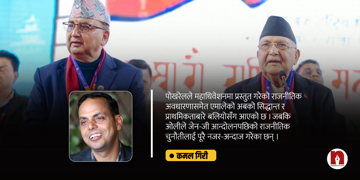 पोखरेलले महाधिवेशनमा प्रस्तुत गरेको राजनीतिक अवधारणासमेत एमालेको अबको सिद्धान्त र प्राथमिकताबारे बलियोसँग आएको छ। जबकि ओलीले जेन-जी आन्दोलनपछिको राजनीतिक चुनौतीलाई पुरै नजरअन्दाज गरेका छन्। नजरअन्दाज मात्रै गरेका छैनन्, त्यो आन्दोलनको निमित्त कारण आफू नेतृत्वको सरकार हो, आफ्नै अलोकतान्त्रिक जिद्दी र सुशासनहीनताका कारणले मुलुक गैर संवैधानिक सुशीला कार्की स्वीकार्नुको बाध्यतामा पुगेको हो भन्ने पनि स्वीकारेका छैनन्।