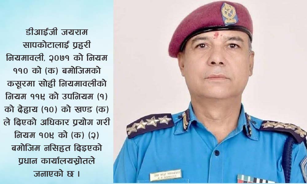 काठमाडौँ । गृह मन्त्रालयले गरेको डीआईजी सरुवाप्रति सामाजिक सन्जालबाट असन्तुष्टि व्यक्त गरेका डीआईजी जयराज सापकोटालाई प्रहरी प्रधान कार्यालयले कारबाहीस्वरुप नसिहत दिएको छ ।
