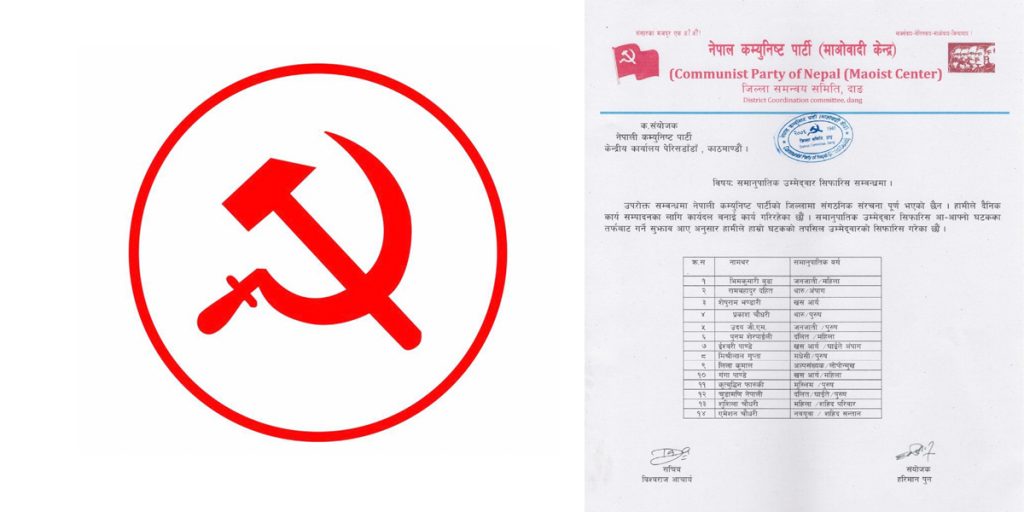 नेकपाको महत्त्वपूर्ण पूर्वघटक नेकपा माओवादी केन्द्र दाङले पूर्व पार्टीकै लेटरप्याड प्रयोग गर्दै १४ जना समानुपातिक उम्मेदवार सिफारिस गरेको छ । सिफारिस सूचीमा नेपाल पत्रकार महासङ्घका निवर्तमान केन्द्रीय उपाध्यक्ष उदय जिएम र अधिवक्ता सुशीला चौधरीसमेत समेटिएका छन्।