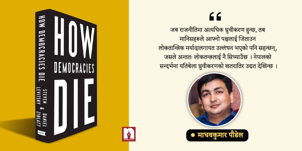 स्टिभन लेविट्स्की र ड्यानियल जिब्लाटको पुस्तक ‘हाउ डेमोक्रेसिज डाई’ पढ्दा अँध्यारो कोठामा कसैले बत्ती बालिदिए जस्तो महसुस हुन्छ । यो केवल इतिहासको पुस्तक मात्र होइन— यो त एउटा सचेतना जगाउने प्रमाणिक दस्तावेज हो । यस पुस्तकले लोकतान्त्रिक जीवनलाई खतरामा पार्ने शक्तिहरू र समाज बिस्तारै स्वतन्त्रताबाट निरंकुशतातिर चिप्लिने सूक्ष्म बाटाहरू बुझ्न मद्दत गर्दछ । किताबमा स्थापित मान्यताहरूको क्षयीकरण र संस्थाहरूमाथिका प्रहारका रिपोर्टहरू प्रशस्तै छन् ।
