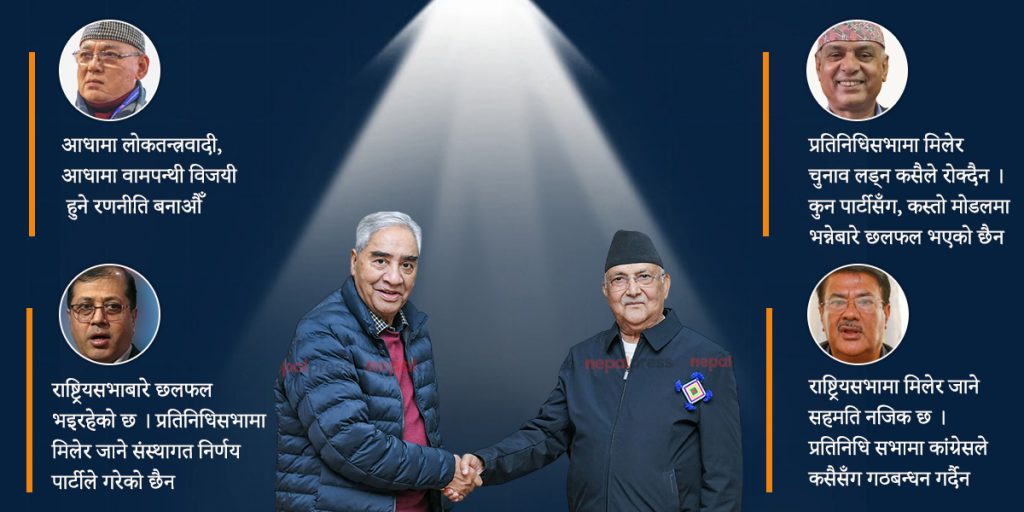 उनले थपे, ‘राष्ट्रियसभामा बाध्यकारी रूपमा मिले पनि प्रतिनिधि सभा चुनावमा कसैसँग मिल्दैनौँ । एक्लै लड्छौँ, चुनावअघिको गठबन्धन पार्टीको हितमा हुँदैन भन्ने हामीले विगतको अभ्यासबाटै पाइसकेका छौँ ।’